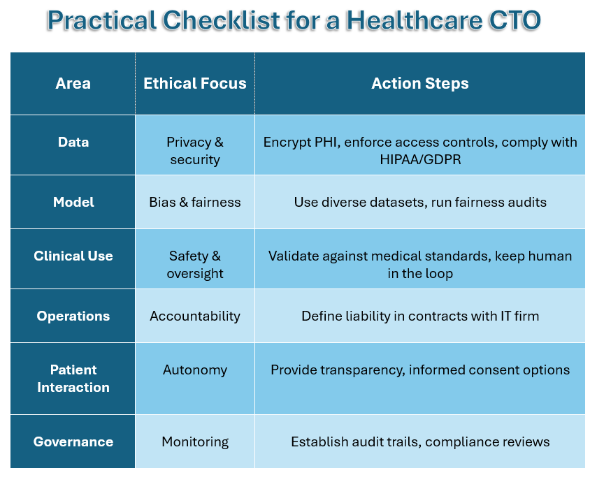 Talking about AI healthcare software development, CTOs must consider ethical AI as a foundational design principle.